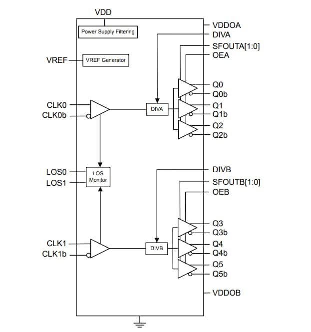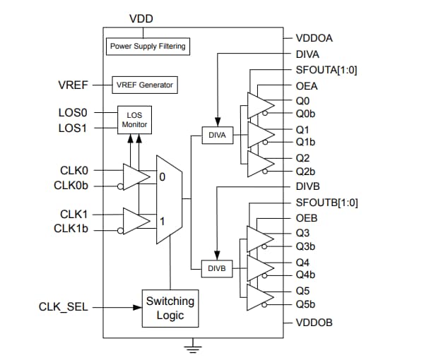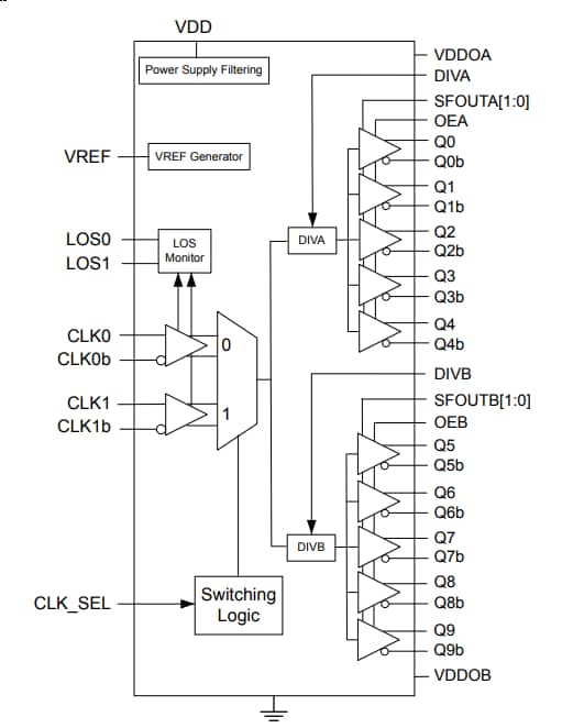 - Loss Of Signal (LOS) monitors for loss of input clock