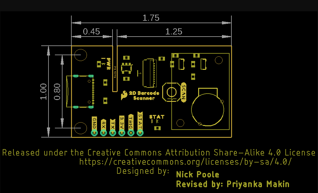 SparkFun Electronics 2D Barcode Scanner Breakout Board features the DE2120 barcode scanner module from DYScan. The DE2120 reads 20 different barcode symbologies (both 1D and 2D) using a camera coupled with onboard image processing to identify and decode various UPCs to QR codes. The DE2120 module also features two LEDs: one for illumination and one to project the red laser line.